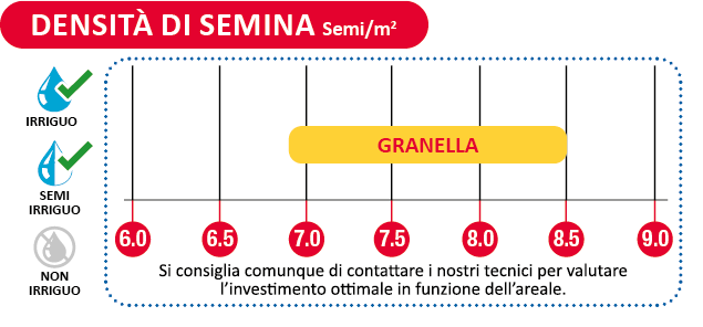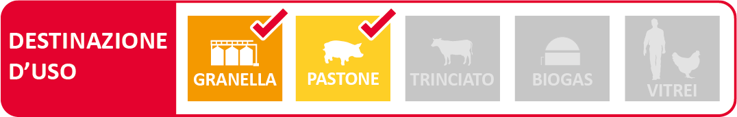 Pianta con elevata tenuta agli stress idrici, taglia contenuta e inserzione regolare e bassa della spiga in tutto appezzamento. Spiga con mediamente 20 ranghi e granella profonda.